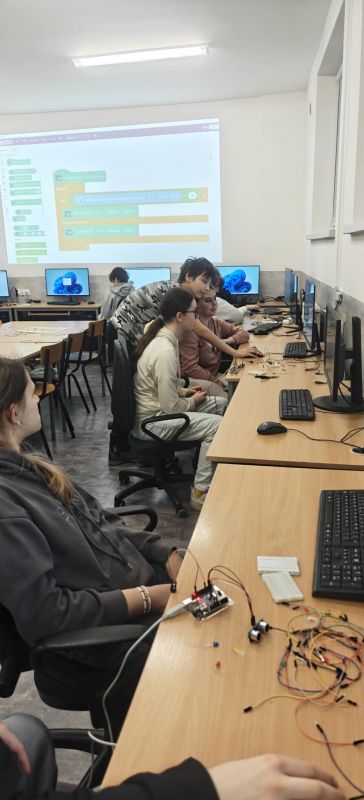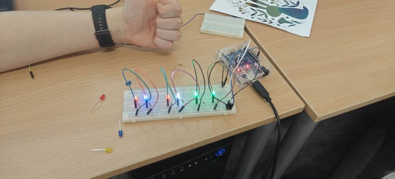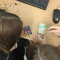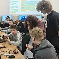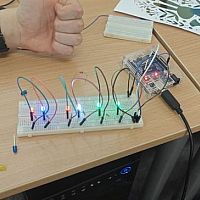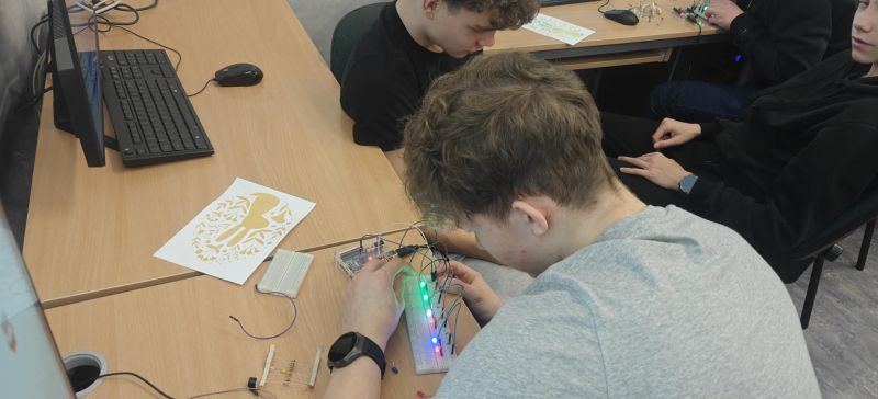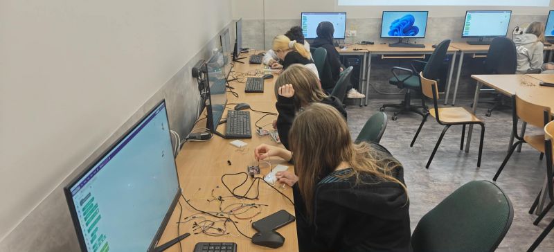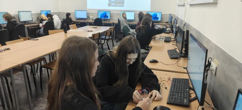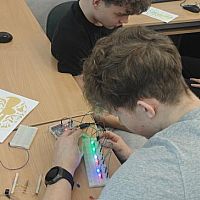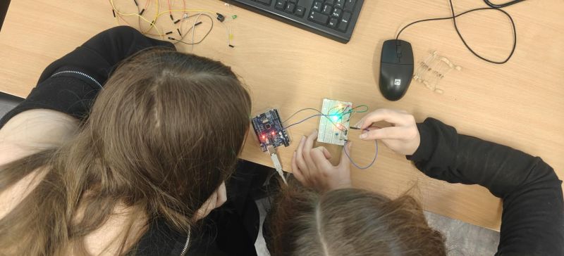 Podczas kolejnych warsztatów uczniowie mieli okazję eksperymentować z elektroniką i programowaniem. Budowali układ oparty o Arduino, łączyli go z diodami, czujnikami odległości, buzerem i przyciskami a na koniec, programowali zachowanie mikrokontrolera, tak by reagował na odległość do przeszkody i wyświetlał komunikaty na wyświetlaczu ciekłokrystalicznym.