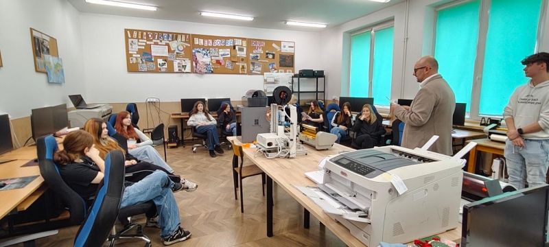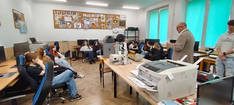 Podczas zajęć uczniowie zapoznali się z podstawami projektowania graficznego oraz zasadami przygotowania projektów do różnych technik druku. W części praktycznej uczestnicy samodzielnie wykonywali złocenie tekstu i grafiki metodą termotransferową, a także realizowali proces sublimacji grafiki na kubkach ceramicznych. Uczniowie mieli możliwość obserwowania i uczestniczenia w kolejnych etapach procesu technologicznego – od projektu graficznego po gotowy produkt.