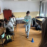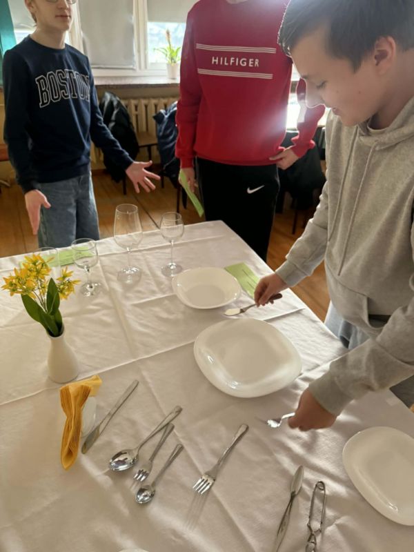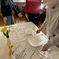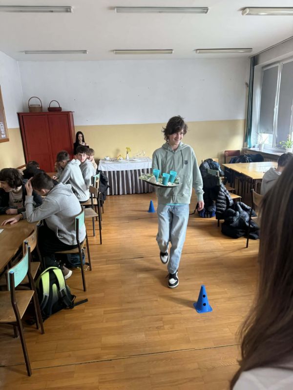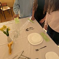 Podczas warsztatów hotelarskich uczestnicy poznali podstawowe zasady profesjonalnej obsługi klienta. Uczyli się rozróżniać rodzaje zastawy stołowej oraz prawidłowo nakrywać do stołu zgodnie z zasadami savoir-vivre. Ćwiczyli także różne techniki składania serwetek oraz prawidłowe noszenie tacy kelnerskiej, zwracając uwagę na estetykę, bezpieczeństwo i ergonomię pracy. Istotnym elementem zajęć było również omawianie i odgrywanie scenek dotyczących rozwiązywania sytuacji konfliktowych w kontakcie z gościem hotelowym . Uczniowie mieli okazję dowiedzieć się, jak reagować na trudne sytuacje, zachowując profesjonalizm, kulturę osobistą.