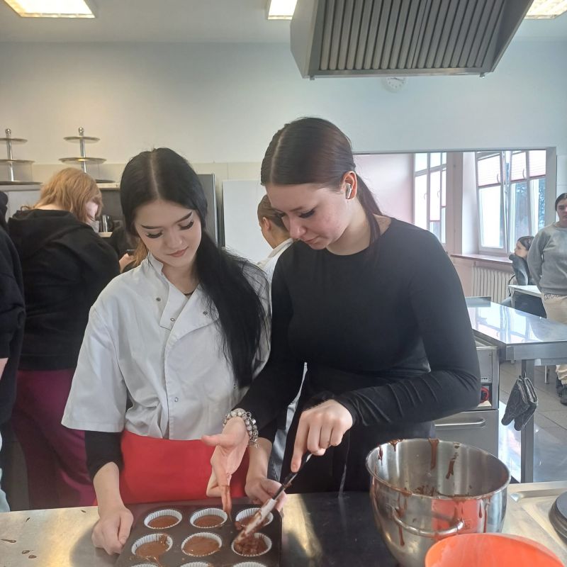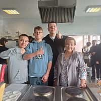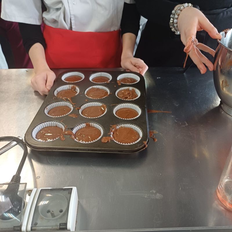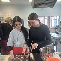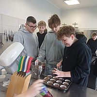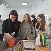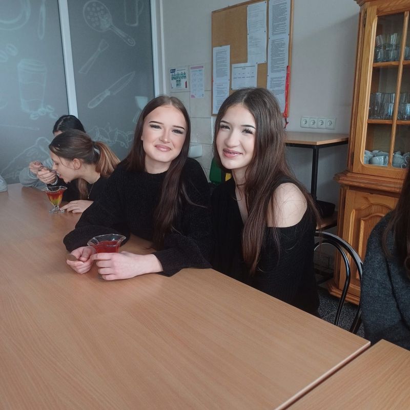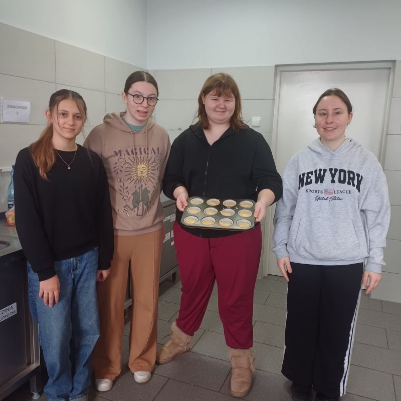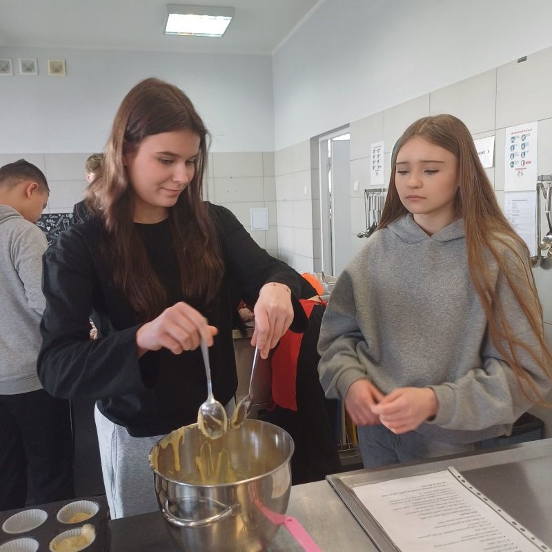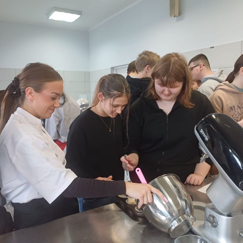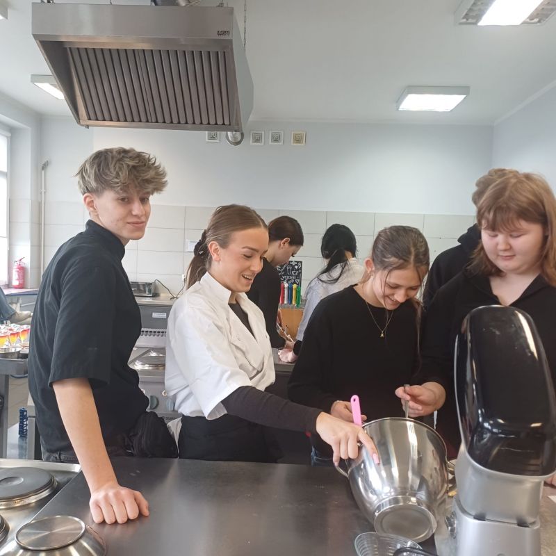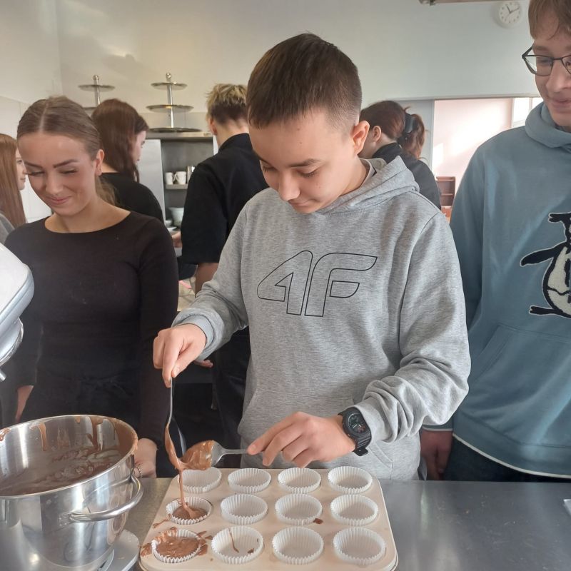 W ramach warsztatów kulinarnych uczniowie zapoznali się z warunkami pracy w pracowni gastronomicznej i z informacjami na temat zawodu technik żywienia i usług gastronomicznych. Młodsi koledzy i koleżanki przy pomocy uczennic z klasy 4TD przygotowali eleganckie i oryginalne wydanie owocowego kisielu, upiekli dwusmakowe muffinki, zapoznali się z prezentacją na temat zdrowego odżywiania oraz rozwiązywali krzyżówki.