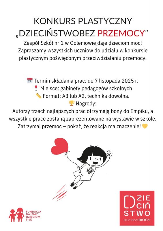 Zespół Szkół nr 1 w Goleniowie zaprasza wszystkich uczniów do udziału w konkursie plastycznym poświęconym przeciwdziałaniu przemocy.