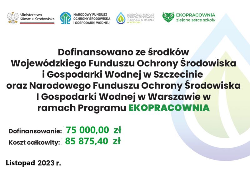 W dniu dzisiejszym odbyło się Uroczyste Otwarciu Ekopracowni „Pracownia-Myślę „EKO-Logicznie””. Utworzonej dzięki dofinansowaniu w kwocie 75 tys. zł z Wojewódzkiego Funduszu Ochrony Środowiska i Gospodarki Wodnej w Szczecinie oraz Narodowego Funduszu Ochrony Środowiska i Gospodarki Wodnej w Warszawie w ramach Programu EKOPRACOWNIA. Całkowity koszt projektu to 85 875,40 zł. W uroczyści udział wzięli Prezes WFOŚiGW w Szczecinie Marek Subocz oraz Starosta Goleniowski Tomasz Stanisławski.